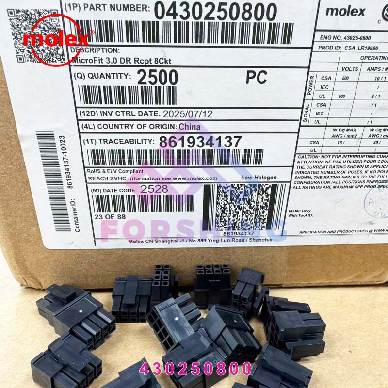 品牌:MOLEX 原厂型号:43025-0800 描述:Micro-Fit 3.0 Receptacle Housing, Dual Row, 8 Circuits, UL 94V-0, Low-Halogen, Black 产品类别: PCB连接器 产品间距: 3.00mm 公端/母端: 母端 包装方式: 袋 参考包装:2500/X=2.26KG V=29*29*11 排数: 2 系列: [ “43025”, “43025” ] 针位数: 8 阻燃等级: UL94 V-0